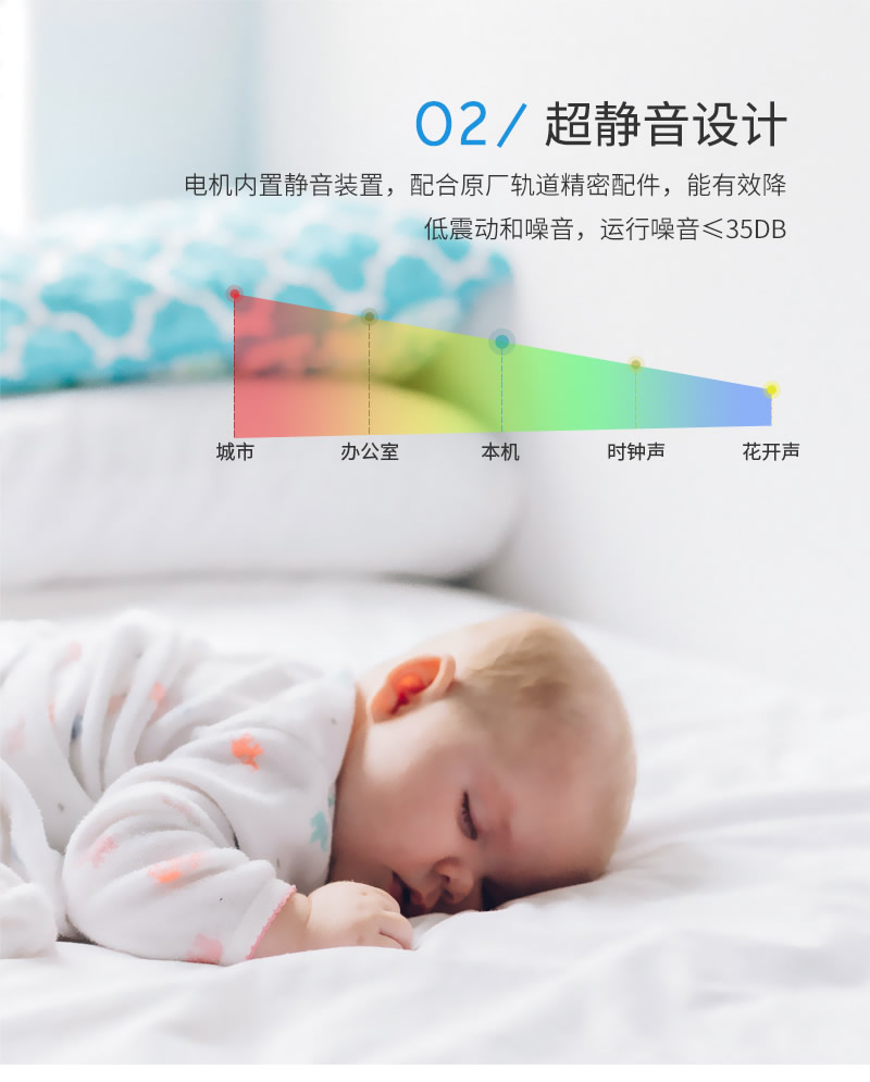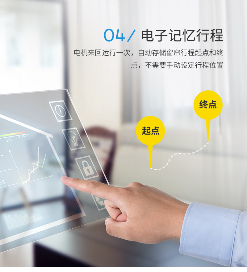 12.面料反彈自動修正功能:電機會自動根據窗簾的尺寸選擇,自動消除記憶窗簾,走動后擠壓,反彈的問題,使每次停在更理想,美觀的位置。
